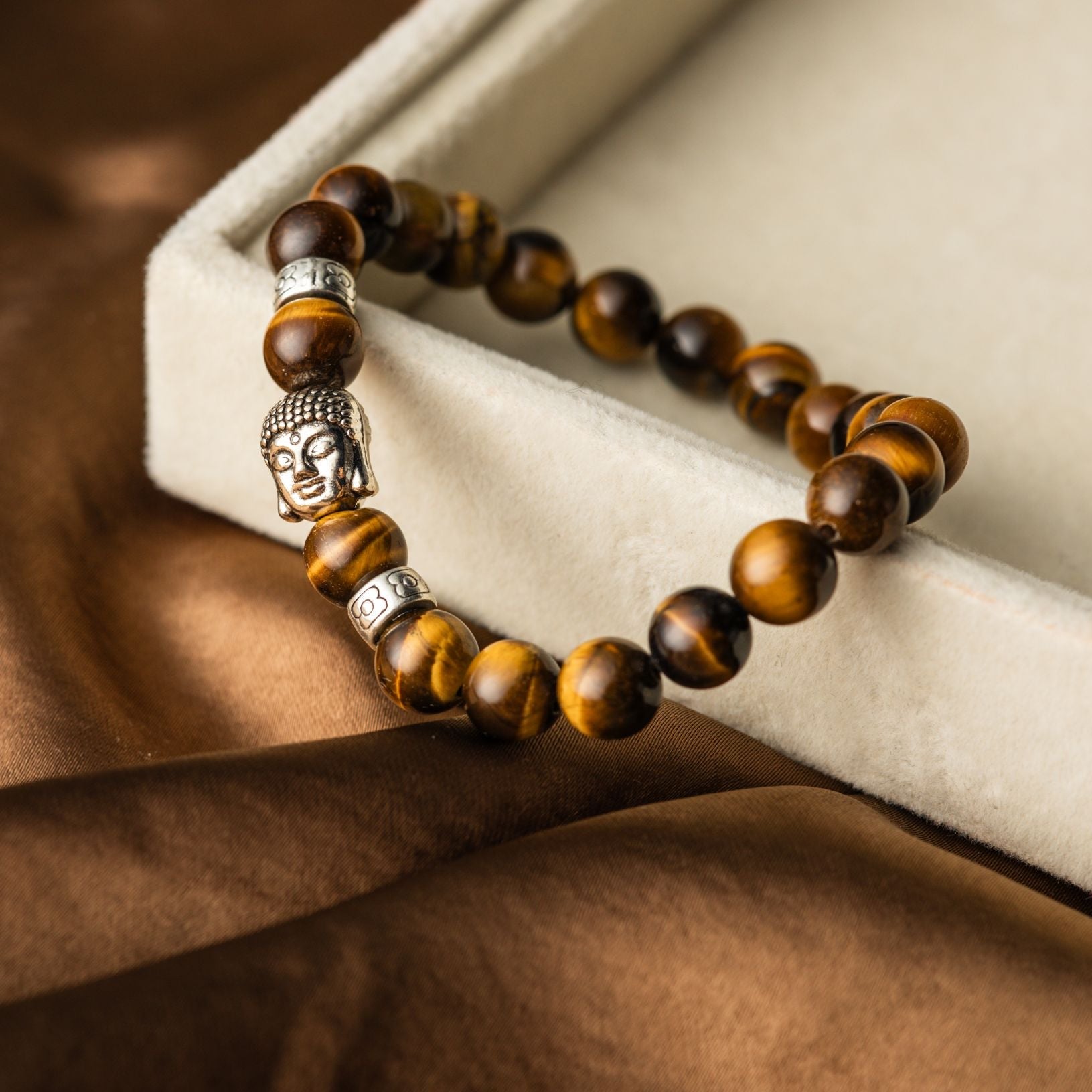 Die natürlichen Tigeraugen-Edelsteine fördern Zielstrebigkeit, Zuversicht und Entschlossenheit. Der silberne Buddha ist das Symbol für inneren Frieden und Spiritualität.