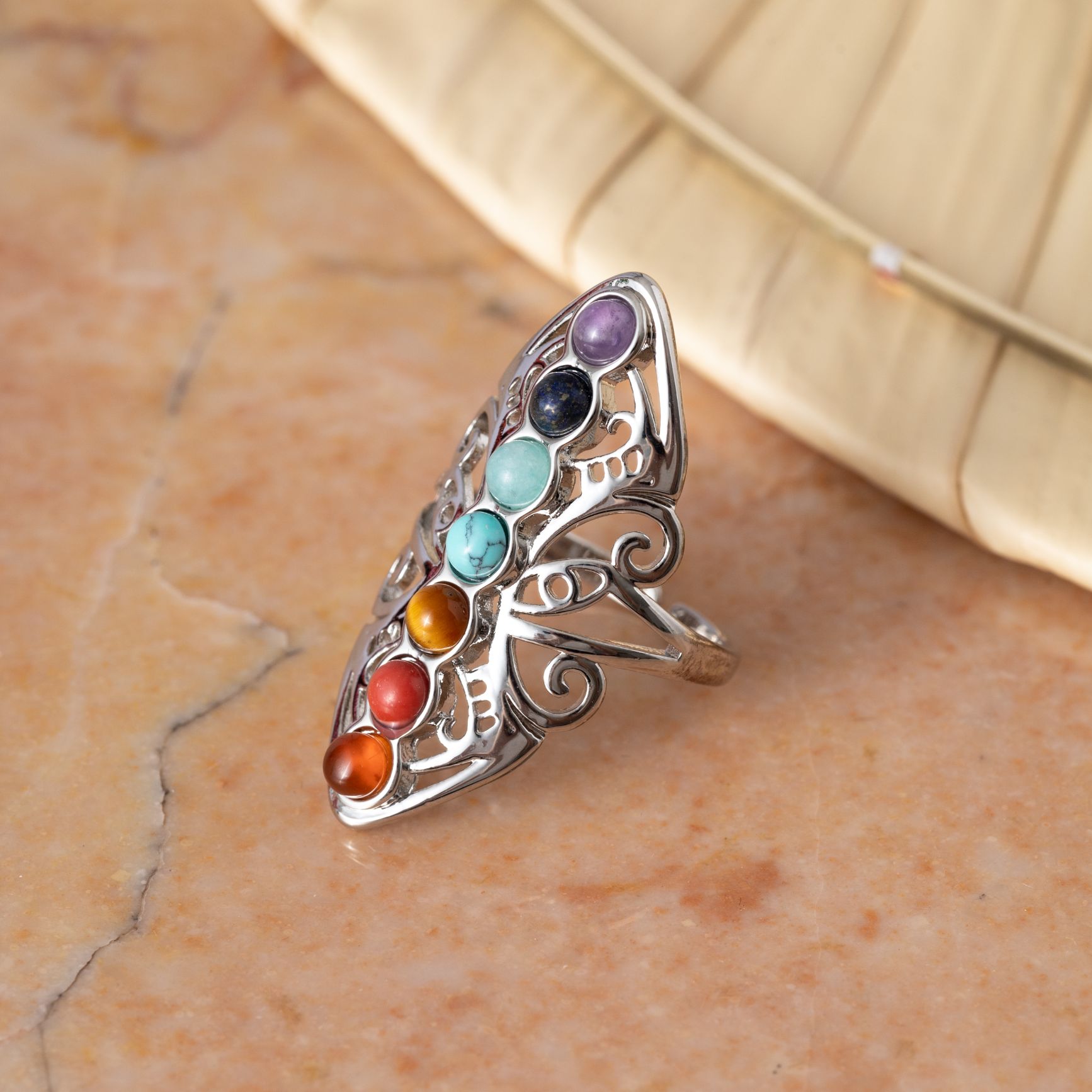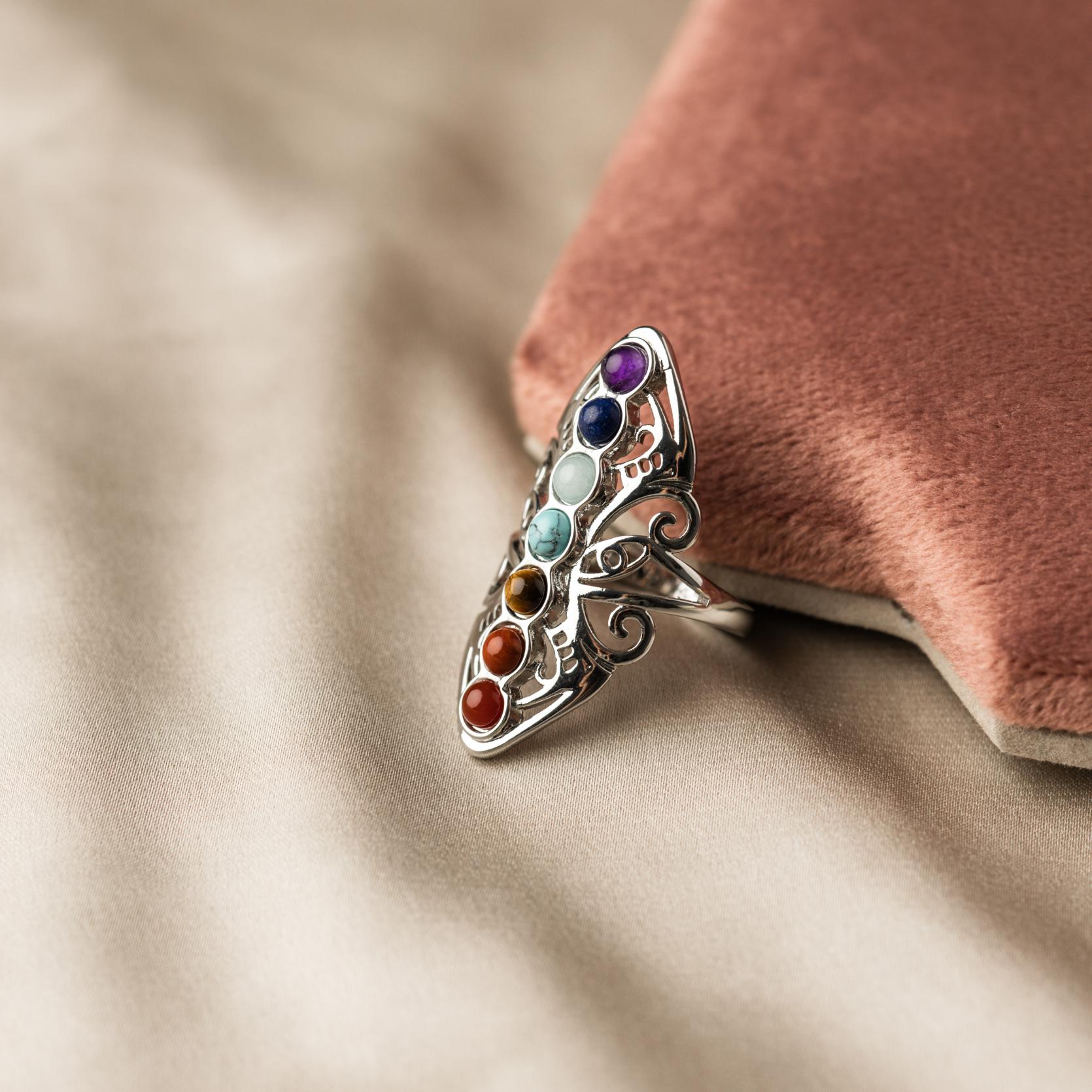Mit diesem farbenfrohen Chakra-Ring kannst du dich täglich an dein Gleichgewicht und deinen Frieden erinnern. Die 7 Edelsteine in diesem schönen Ring stehen für deine 7 Chakren, die Energiezentren in deinem Körper.