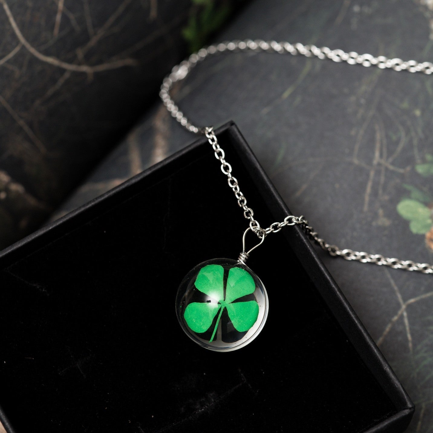 Diese Halskette besteht aus zwei halbierten Lupen, so dass das Kleeblatt aus allen Blickwinkeln gut sichtbar ist.