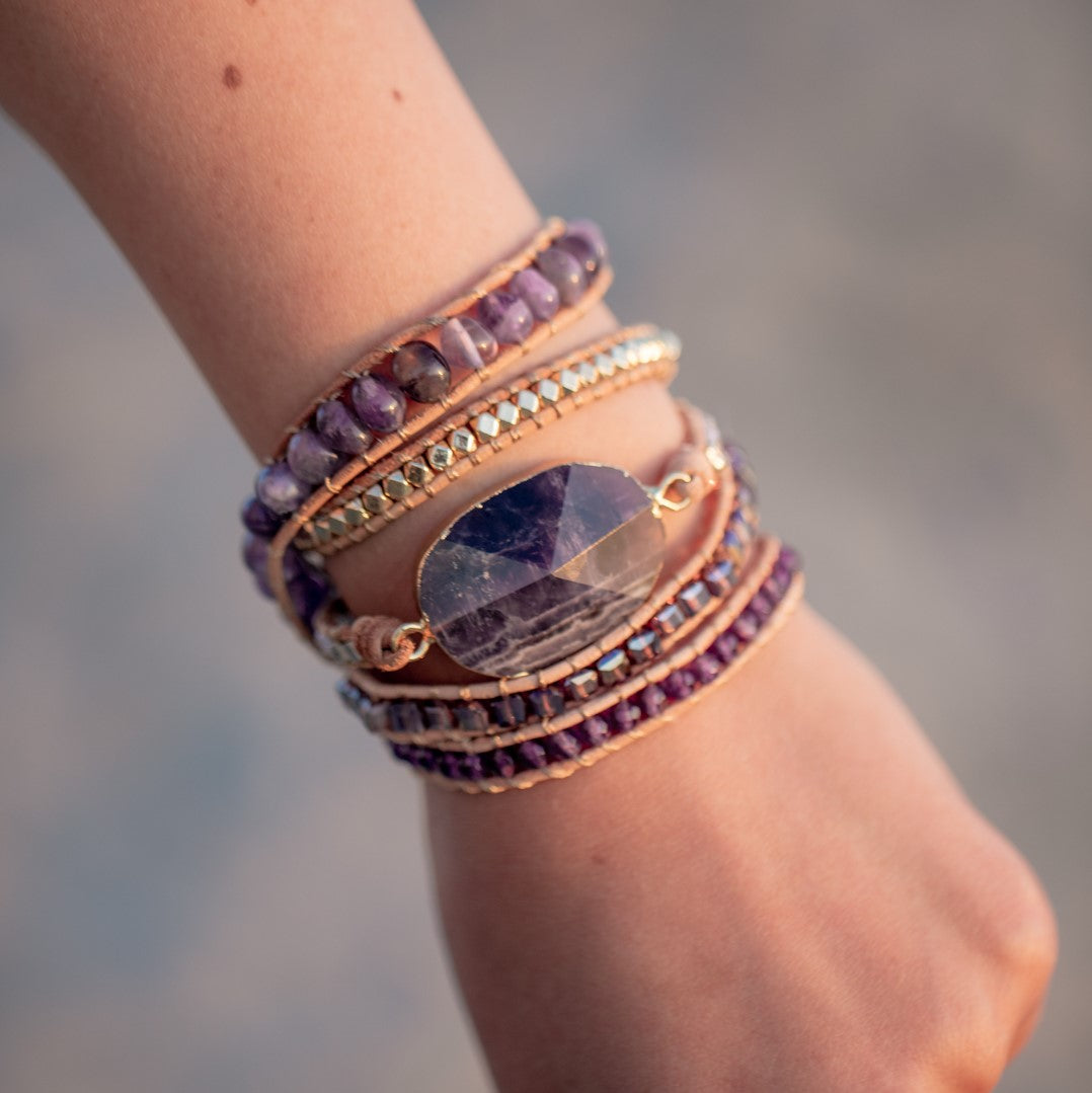 Farbenfroh, elegant und bedeutungsvoll. Dieses Wickelarmband wird überall die Aufmerksamkeit auf sich ziehen. Es kombiniert die tiefvioletten Farben des Amethysts mit der besonderen Wirkung dieses Steins.