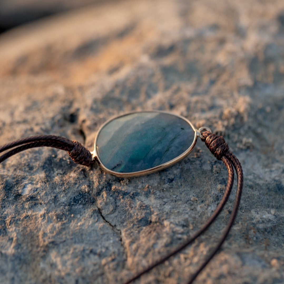 Dieses besondere Armband ist aus einem Labradorit im Polygonschliff gefertigt. Das Armband ist in 3 Positionen verstellbar und fühlt sich durch die geschmeidige Wachskordel weich um das Handgelenk an.
