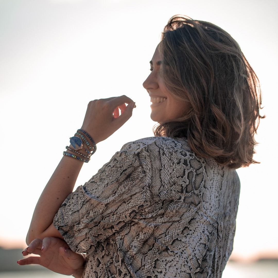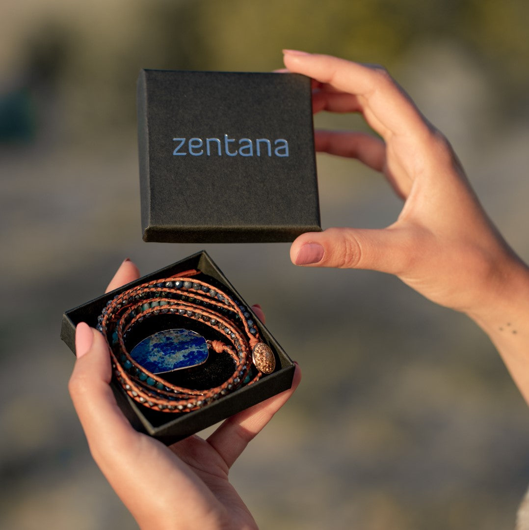 Die runden Perlen in diesem Wickelarmband sind aus dem kleinen Bruder des Lapislazuli, dem Sodalith. Sodalithsteine stehen fürSelbstachtung, Selbstliebe und Treue zu sich selbst. Dieser Stein ist für seine sanfte Wirkung bekannt.